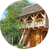 Unser Saunahof besteht aus einem kleinen Ensemble von Schrotholzhäusern, welches in Form eines kleinen Bauernhofes angelegt ist. In diesen Häuser (Schrotholzsauna, Torhaus und Rauchsauna) können verschiedene Saunen genutzt werden.